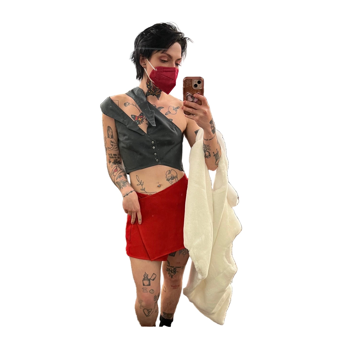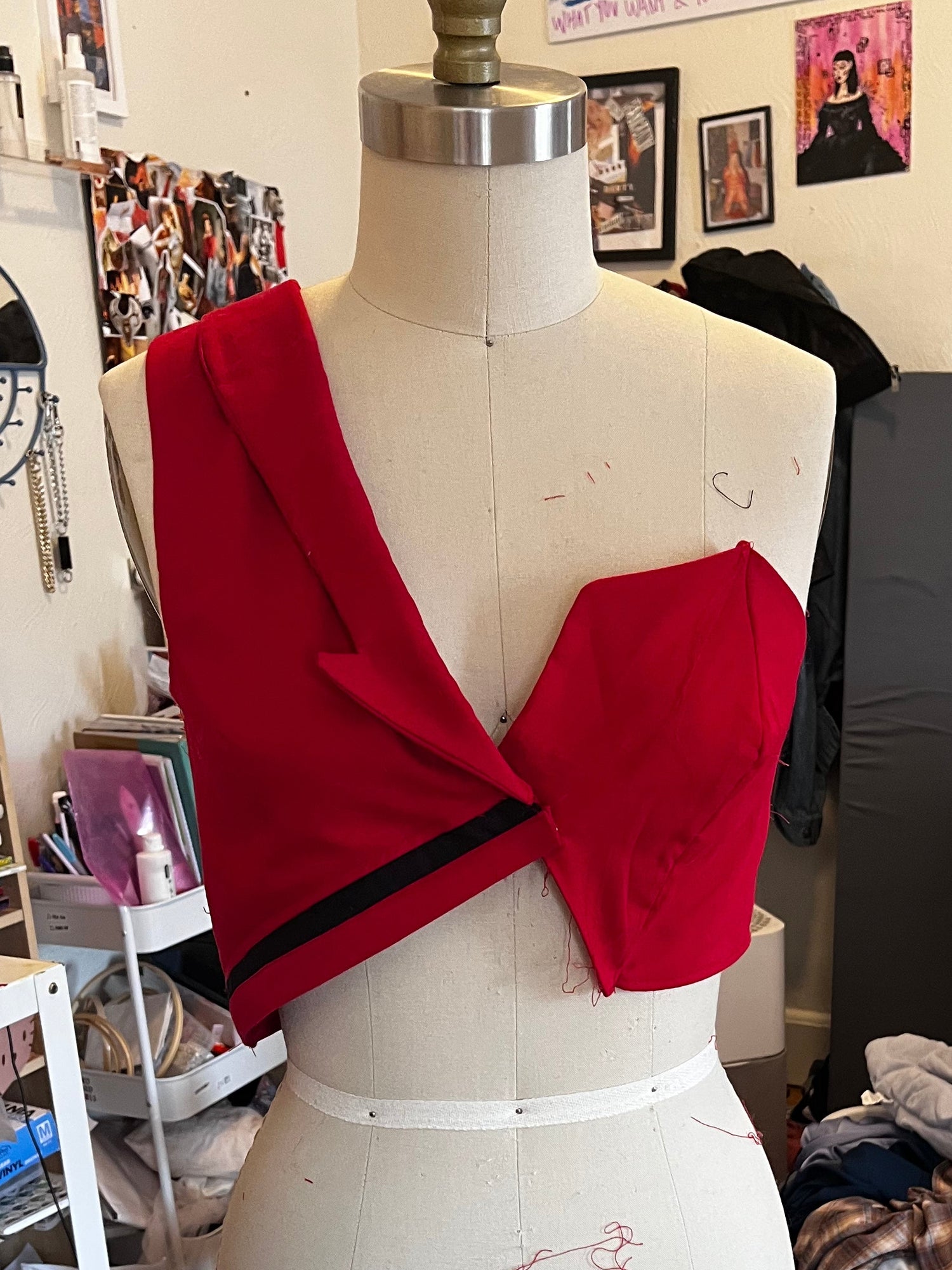 a one shoulder top that is sort of a play on a tailored shirt or jacket. Made as part of my processing my time working in an office, and marking this on my calendar to ensure Microsoft Teams would stay quiet, for just a bit. skirt and vest also made by me.