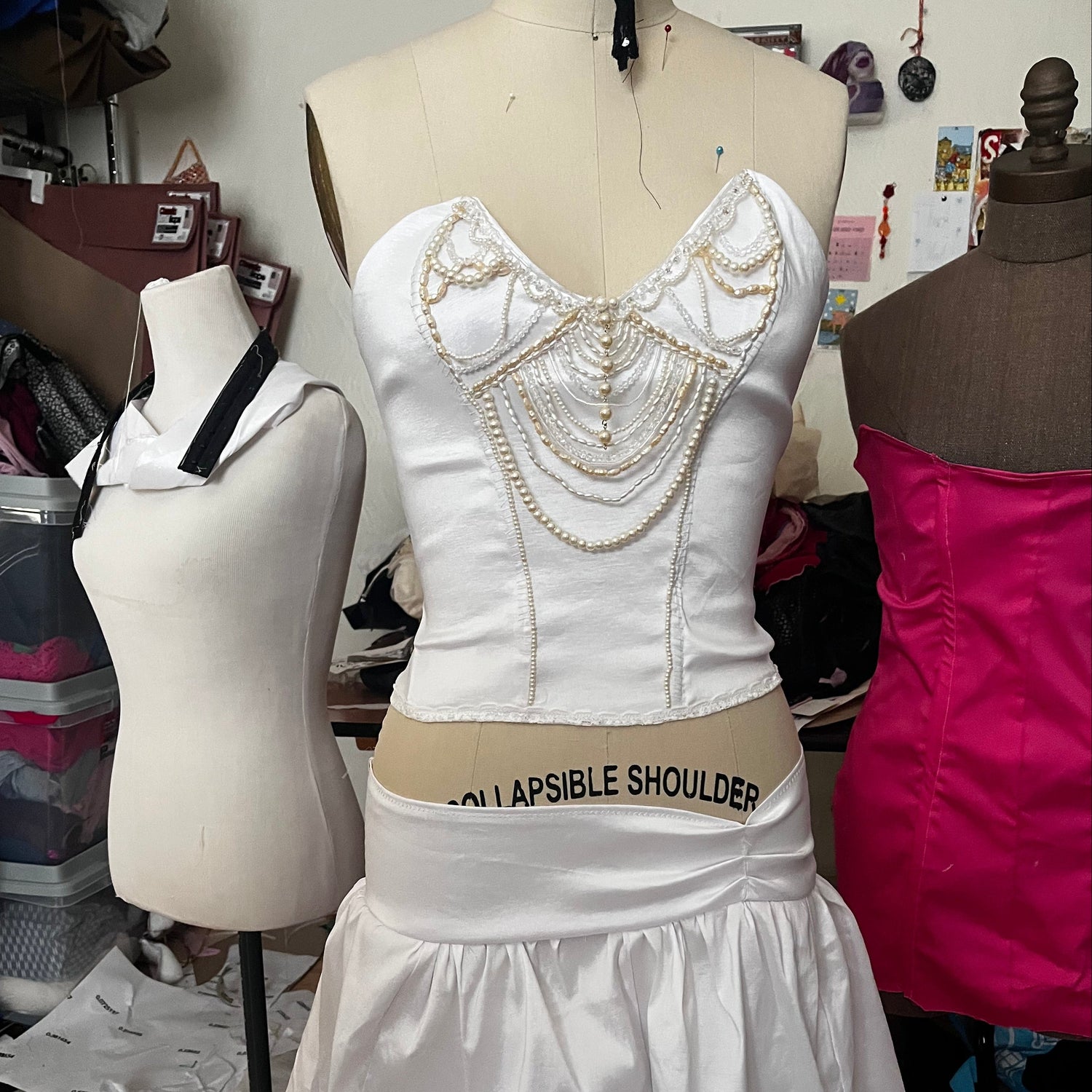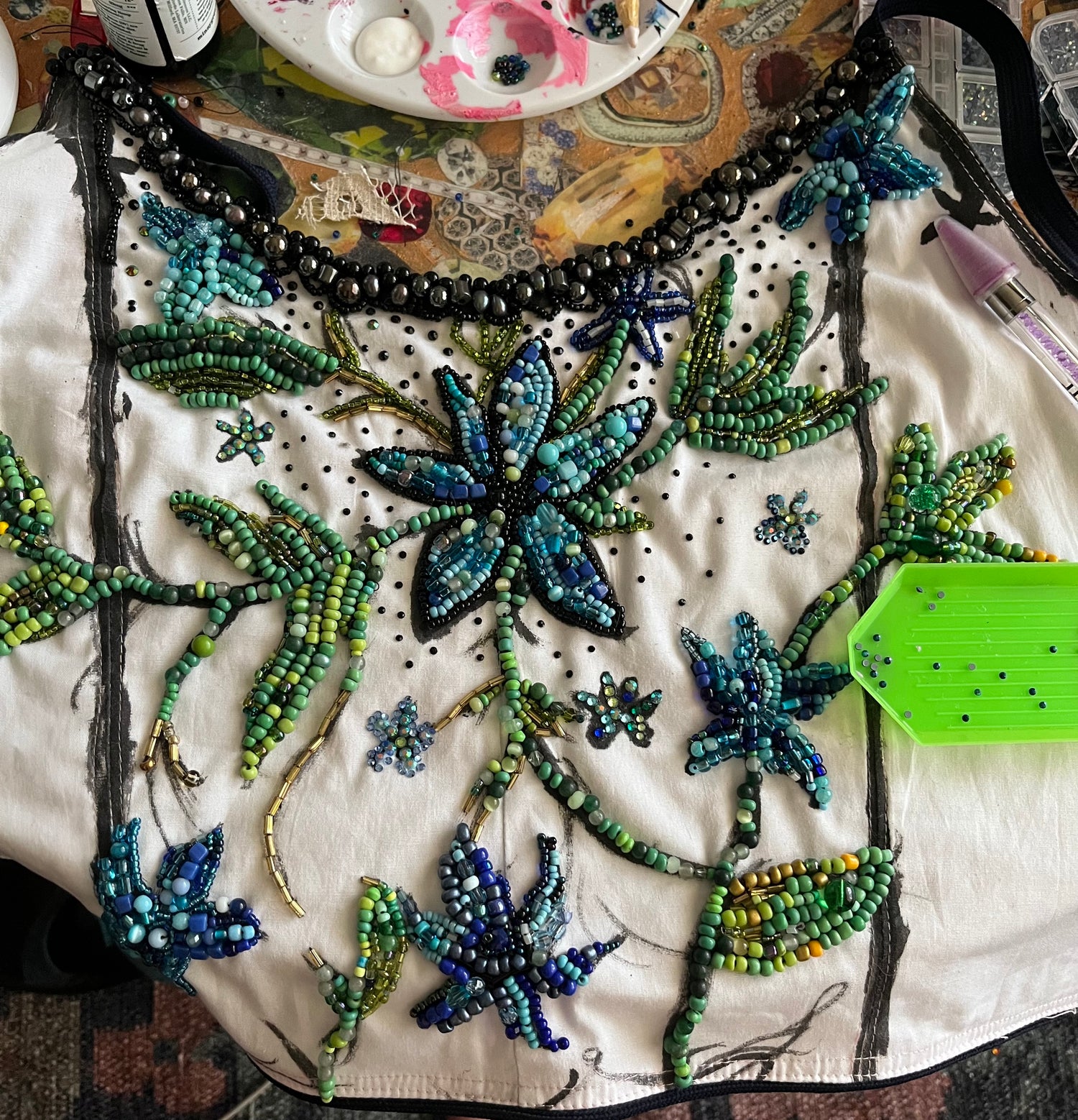 I decided to paint this pattern onto a bodice I had made, and then, for whatever reason I decided to hand bead the entire thing. I have no idea how long this took me.