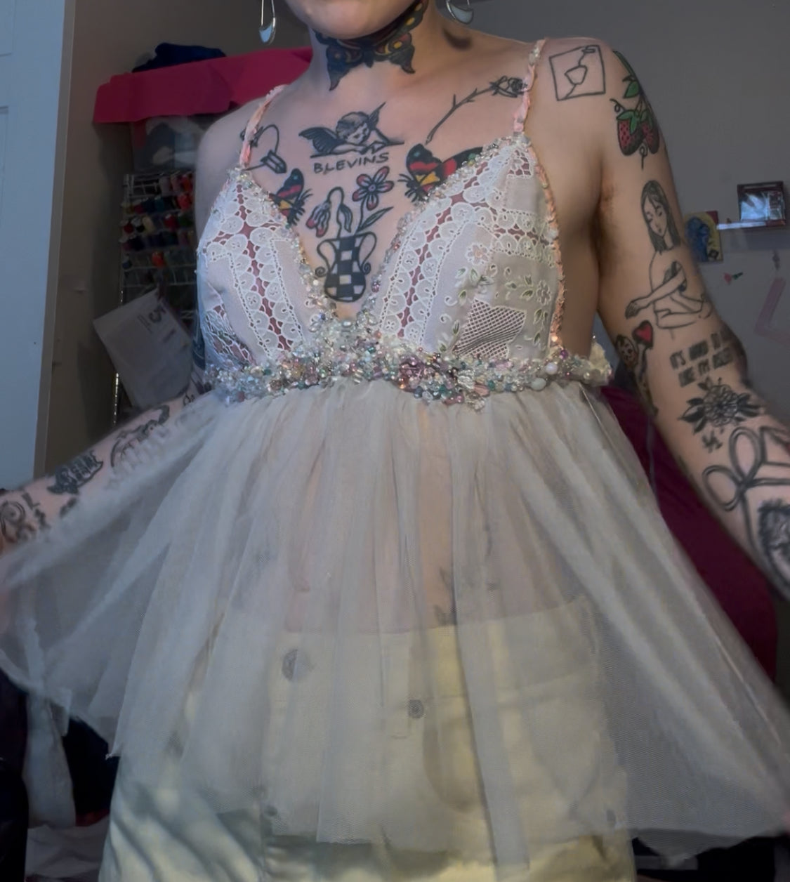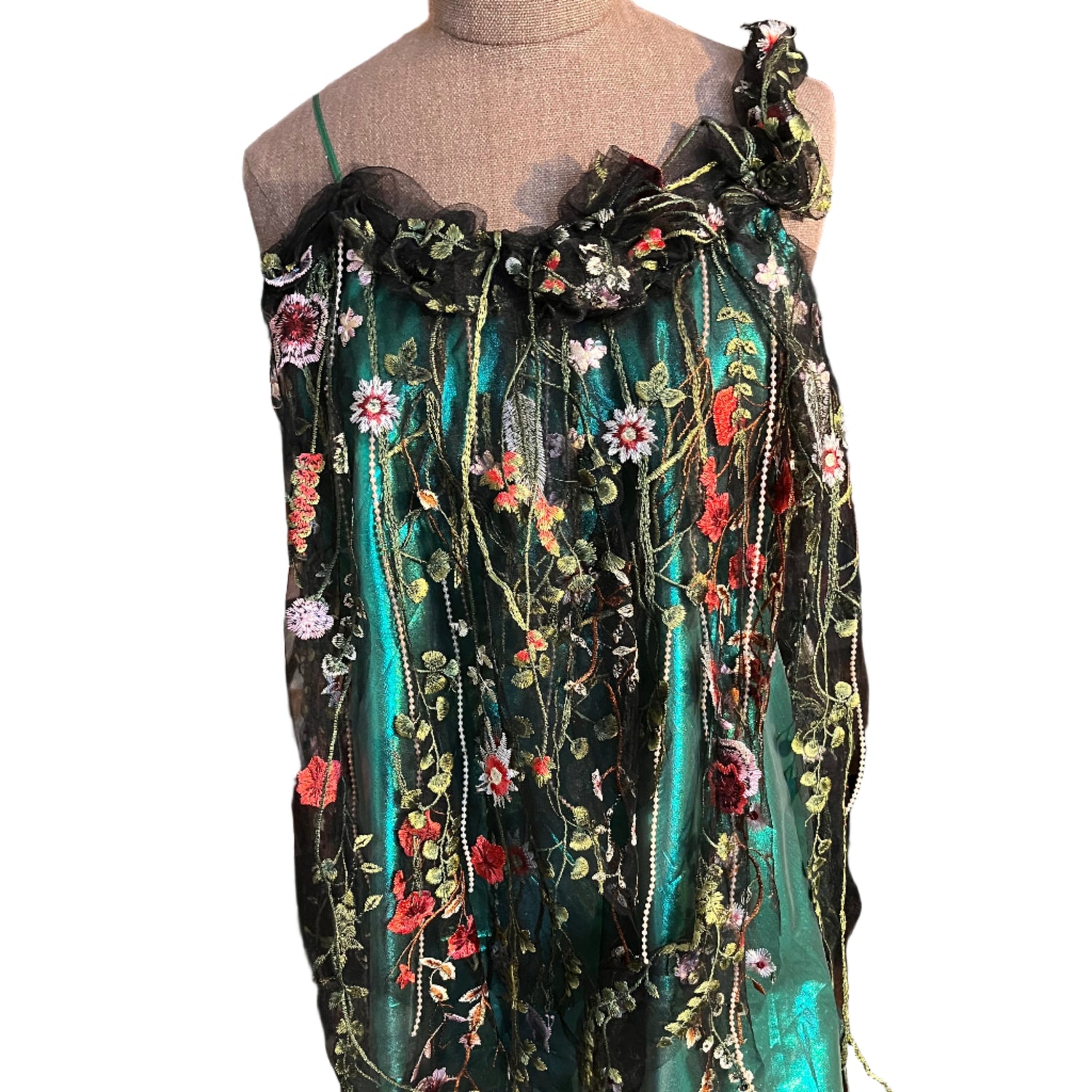 fun whimsical dress, with pearl beads and pieces of embrodiered mesh that I got in a box of fabric from fb marketplace. I cut it up into strips and draped it over the tissue taffeta bias cut dress.
