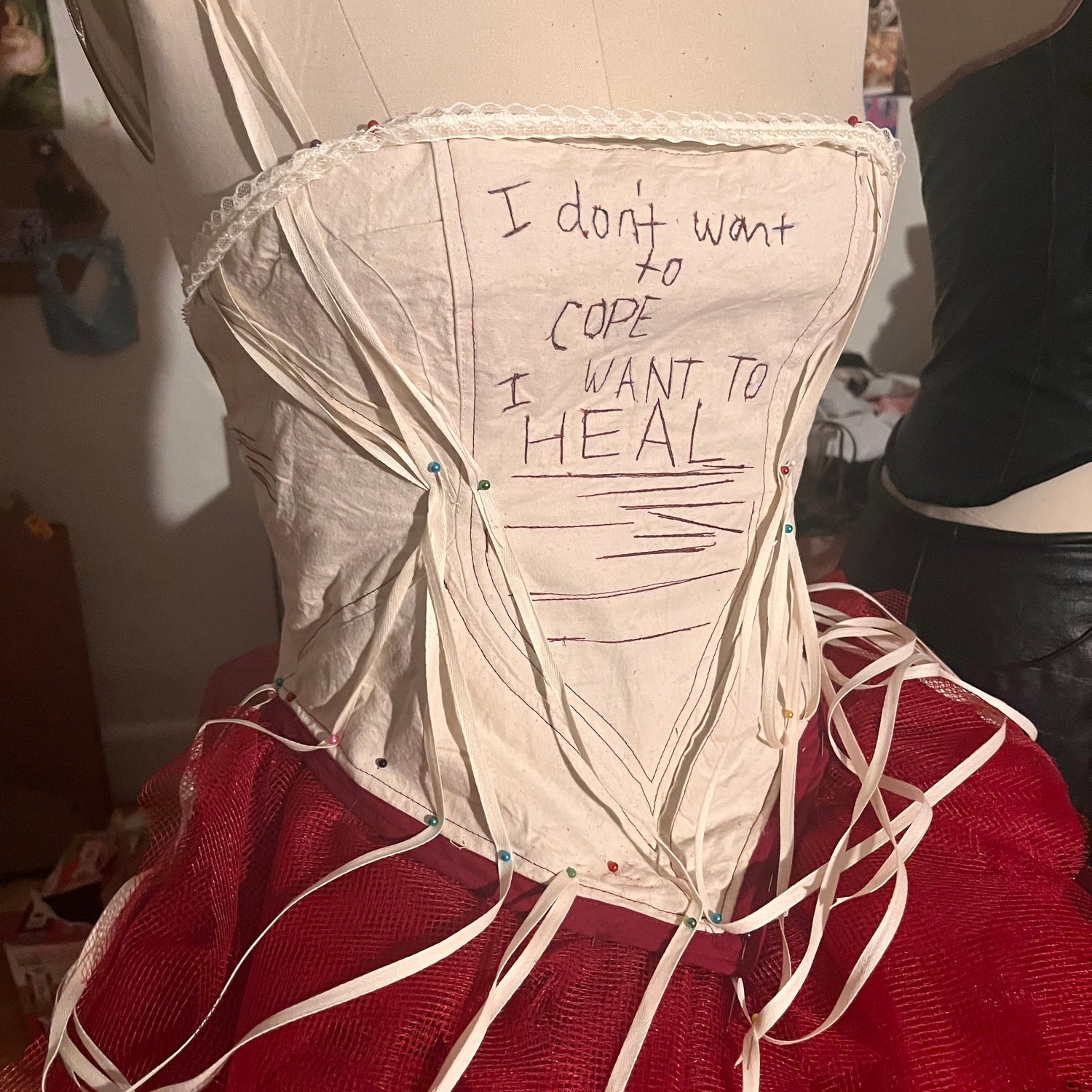 I pulled this quote from my journals from January 2025. red netting skirt with a canvas bodice and twill tape accents. I have struggled with my mental health since since I was a teenager. This piece is both painful and beautiful to me, and a reminder to work towards healing.