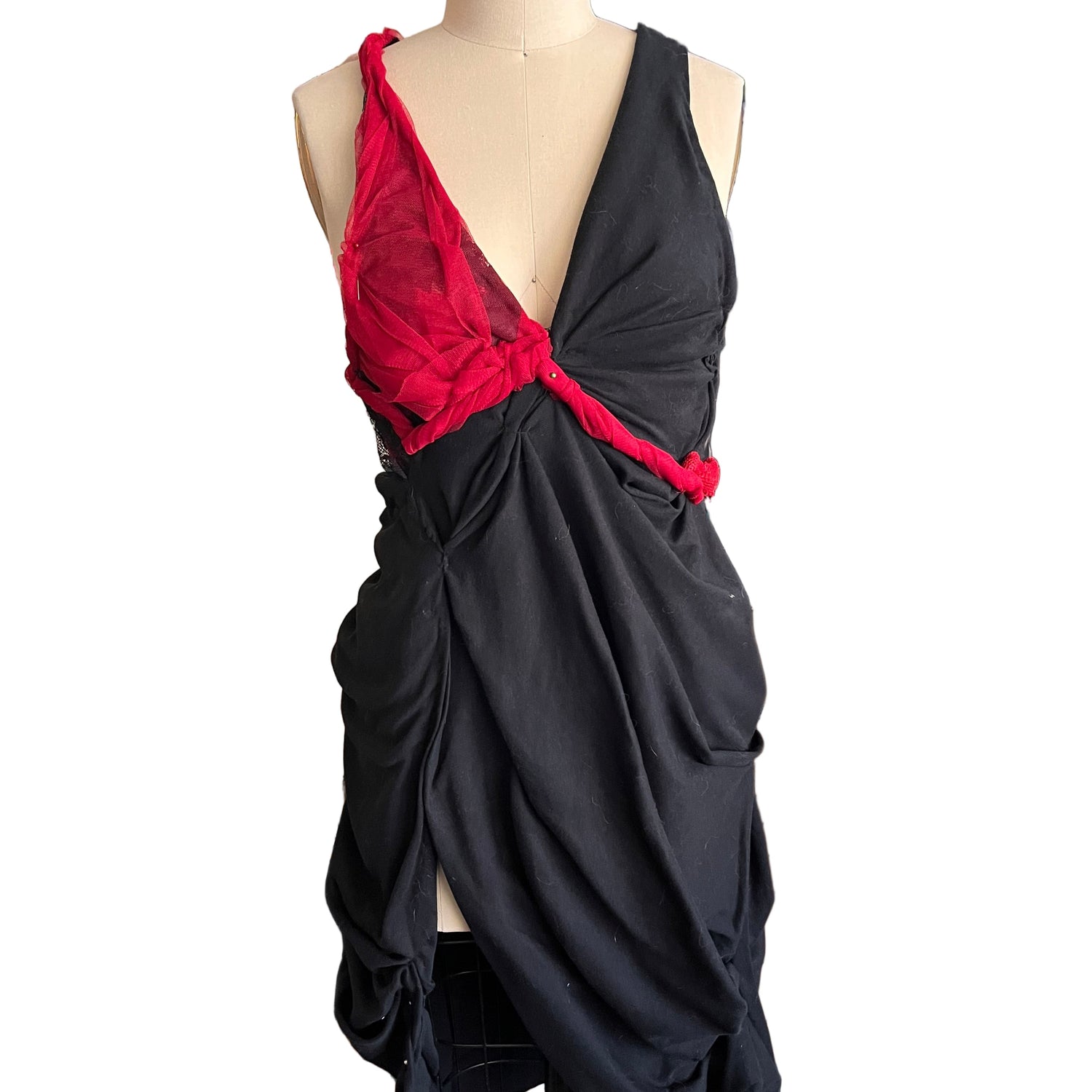 I've been trying to find ways to use up this black knit fabric that I just don't love working with, and I found a way that I actually like. a draped dress, using some red scrap tulle, about heartache and heartbreak.